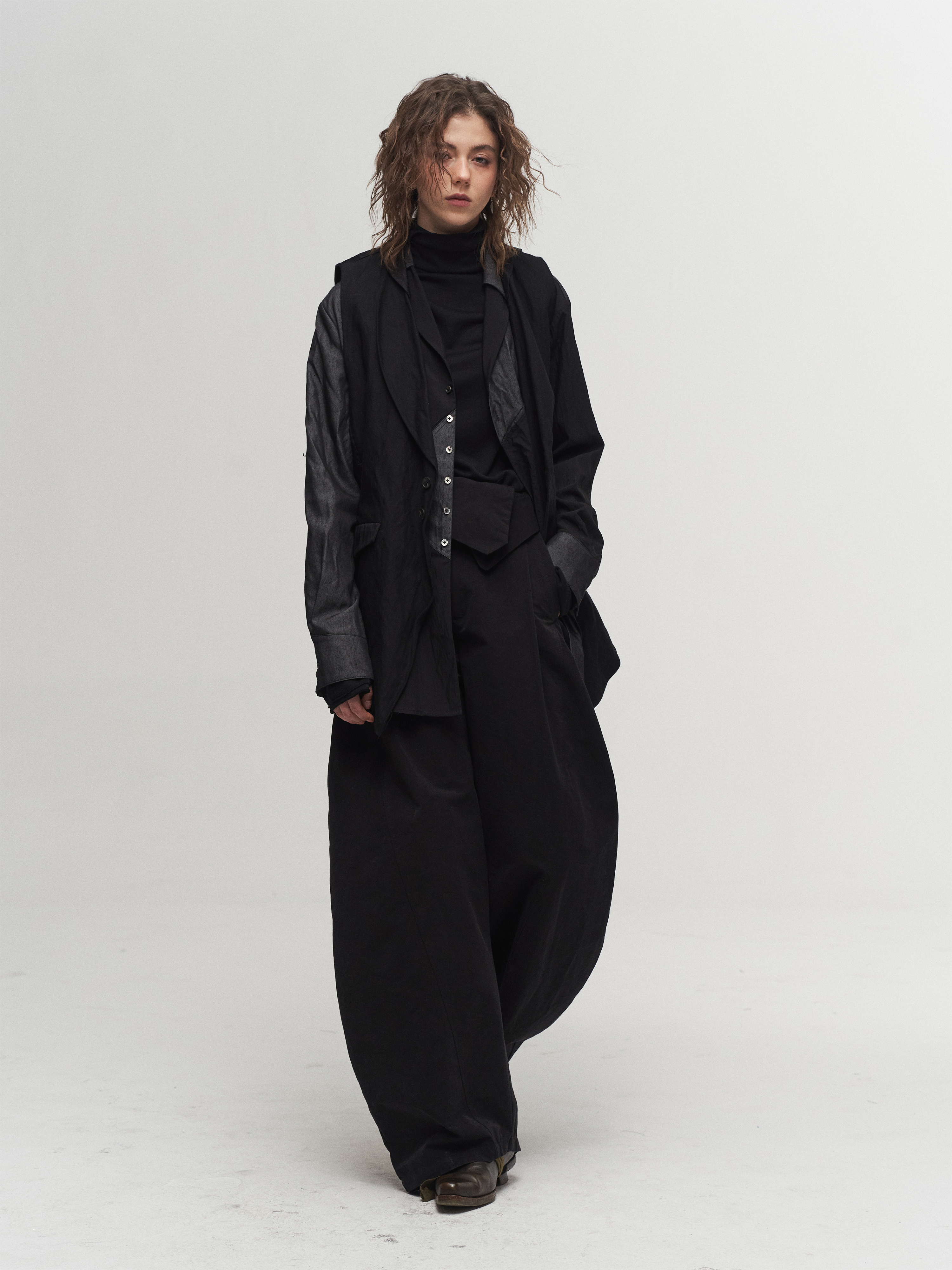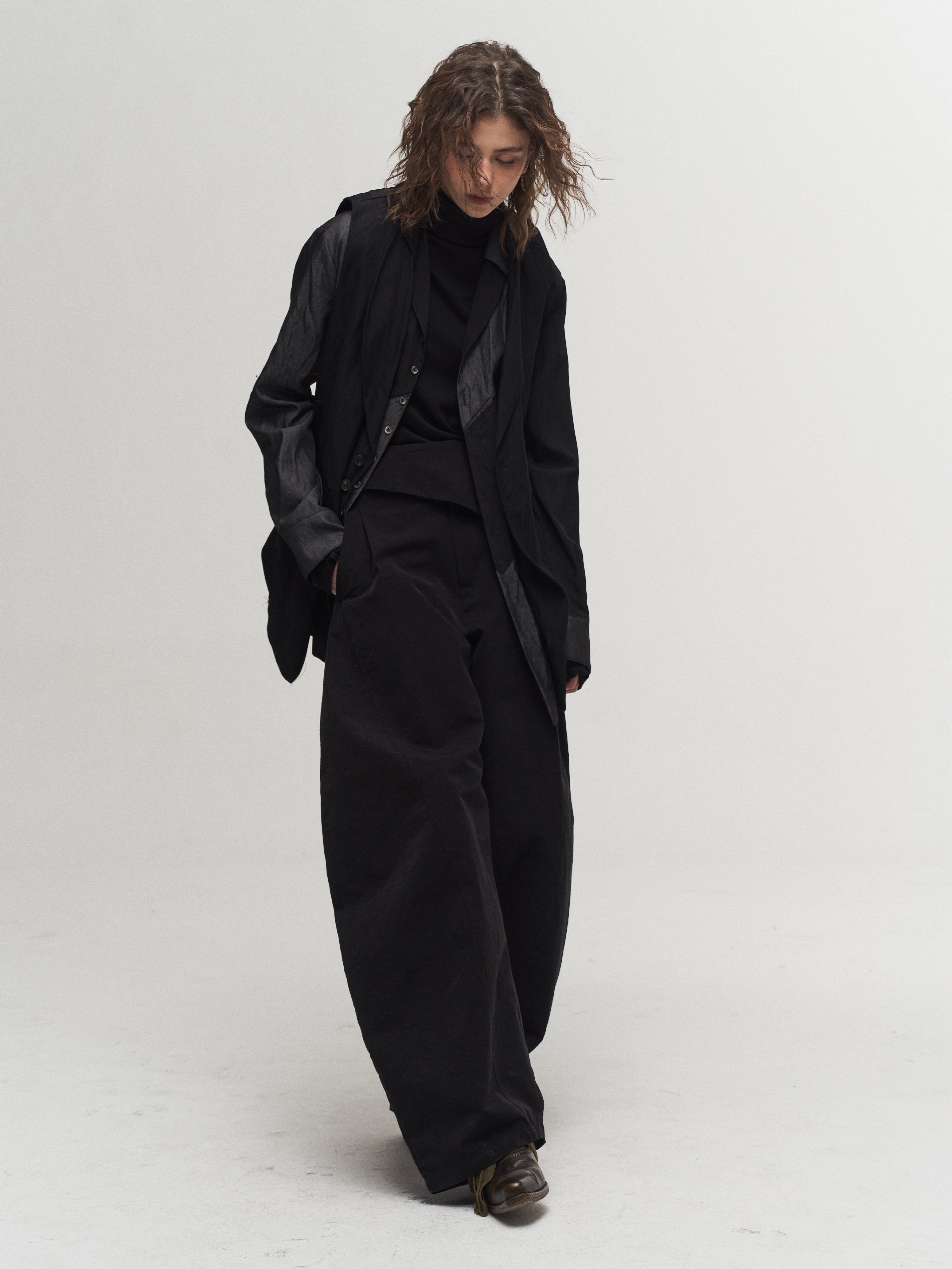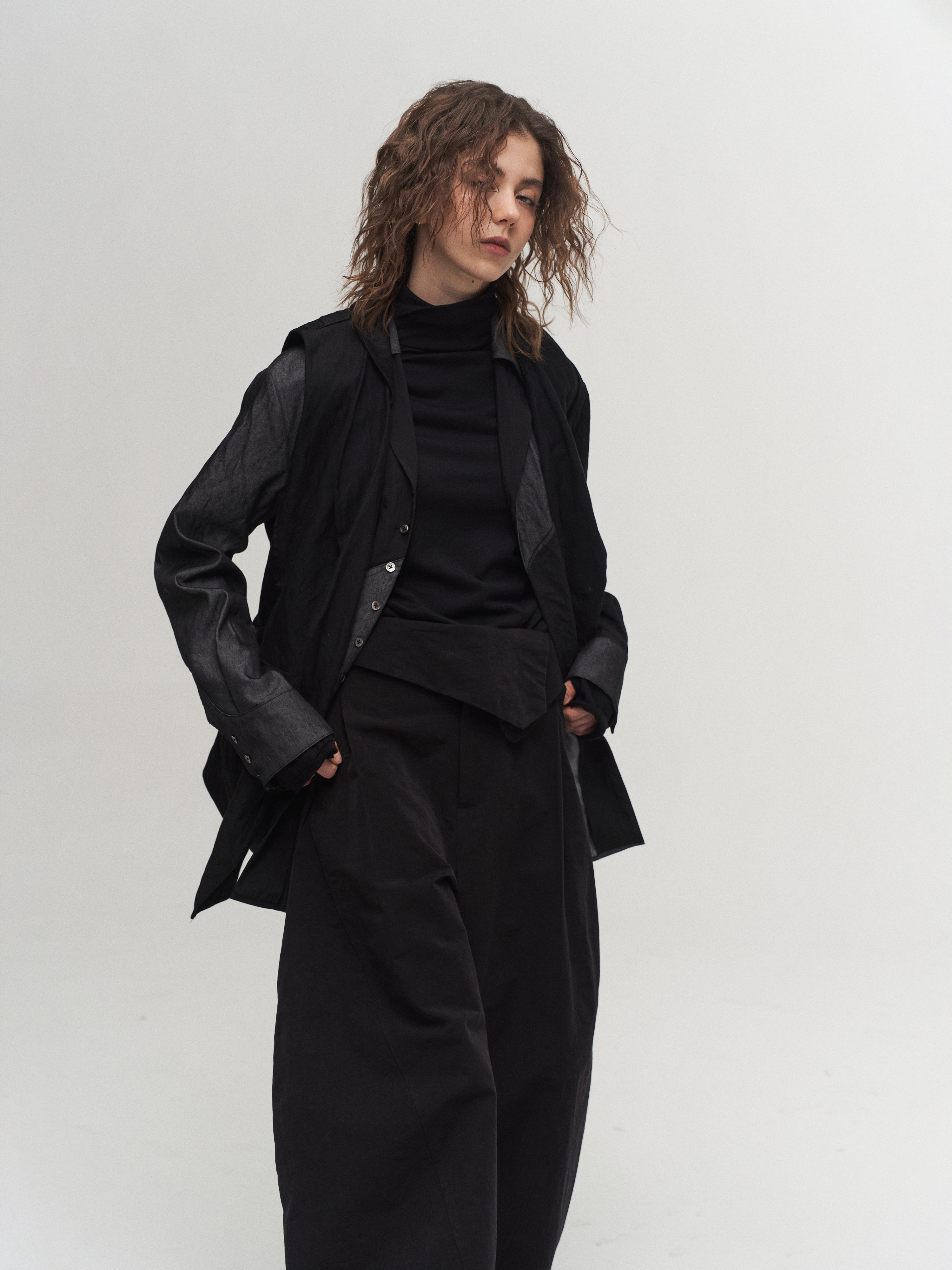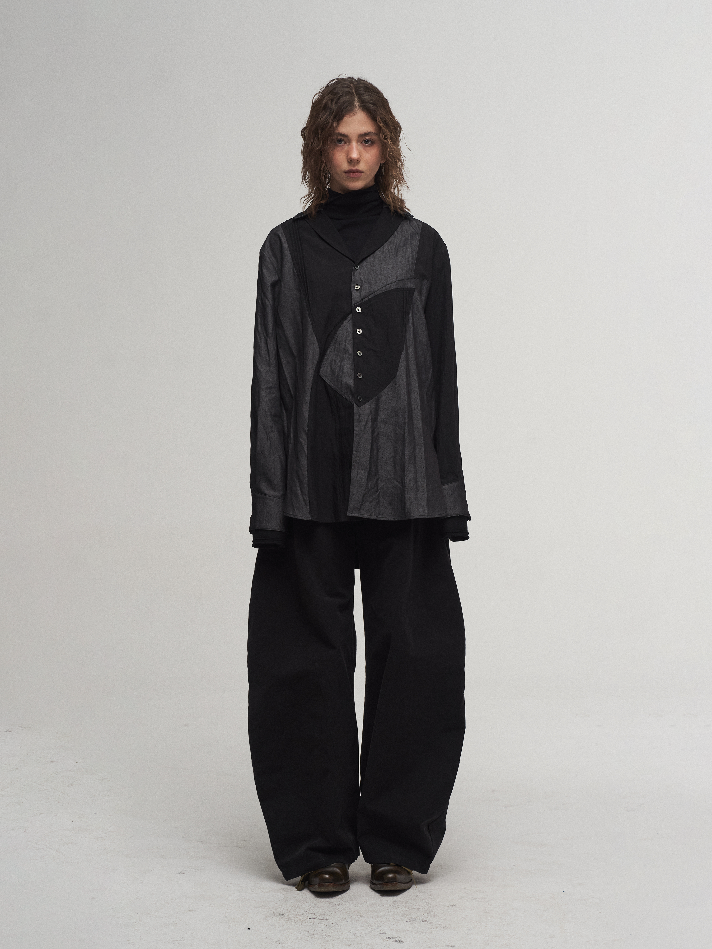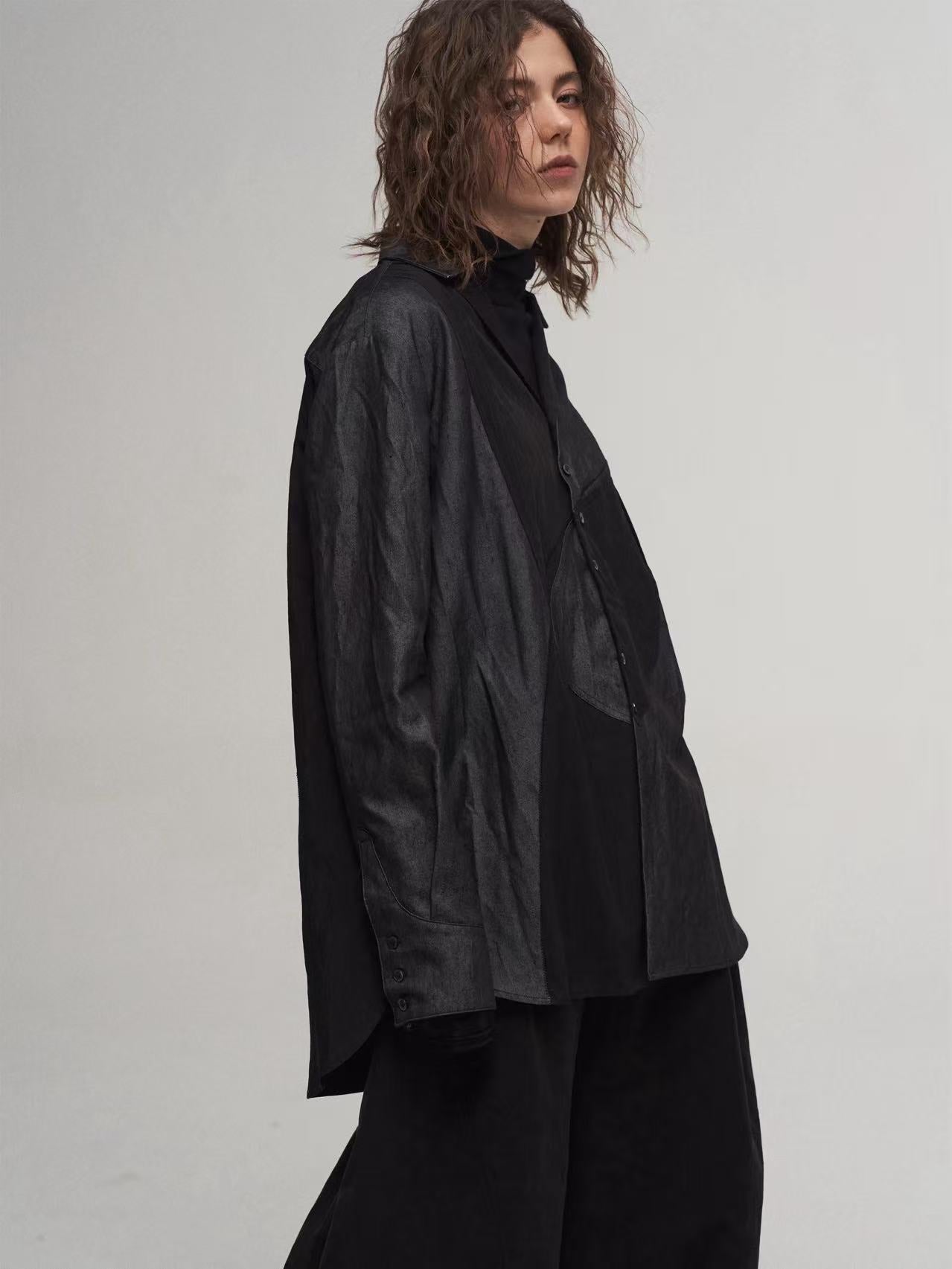 Colorblock patchwork of denim-texture and black fabric